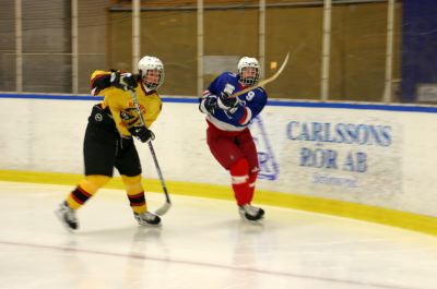 Närkamp i första dammatchen mellan två länslag på väldigt länge. Jennifer Dahlén, Strömsund, och Brunflos Anna Sjödin jagar pucken. Foto: Holger Persson |