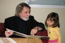 Per Åhlin skriver en hälsning i boken Dunderklumpen till 3-åriga Ollvia Jhalagamage innan hon ska se teatern.