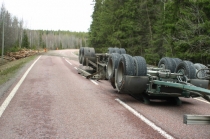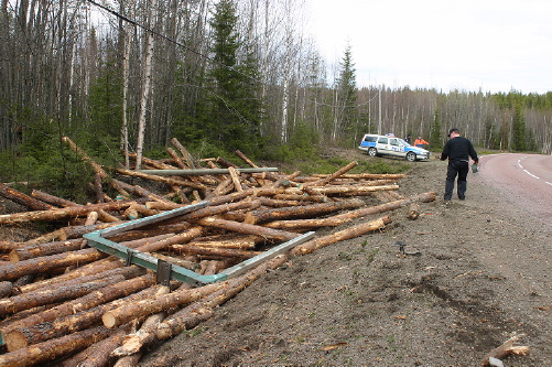 Timmersläpet blev liggande upp och ner på vägen sedan