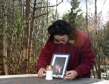 Carlos mamma Estrella Pizarro hedrade sin försvunne son med ett tänt ljus vid en ceremoni vid Kvarnån där han sågs sista gången innan han försvann för ett år sedan. Foto: Holger Persson |