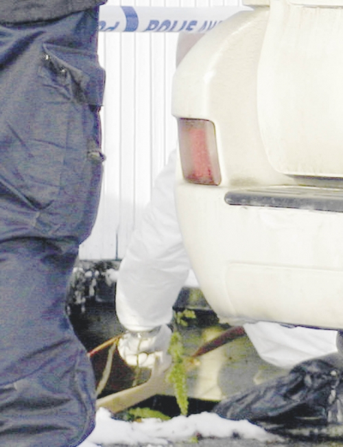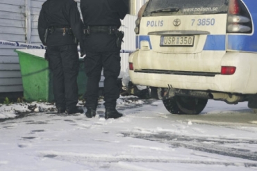 Polisens tekniker tar hand om en kniv som hittades under förrådet. Polisen har ännu inte identifierat mordoffret. Foto: Holger Persson |