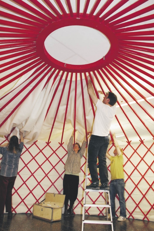 Göran Posthuman på stegen, Gun Skogsberg, Moa Cromberger och John Holmgren bygger ett mongoliskt nomadtält på Hjalmar Strömerskolan. Nomadtältet kommer att användas av en slöjdkonsulent som ska vara med på Mångfaldsfestivalen. Foto: Holger Persson |