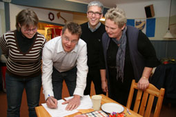 Dokumentet undertecknas av Jeanette Jonsson, ordförande IFK Strömsund ishockeysektionen, Ola Sonidsson, ordförande IFK Strömsund, Pea Israelsson, klubbdirektör Skellefteå AIK och Karin Holmqvist, Rektor Hjalmar Strömerskolan. Text/Foto: Holger Persson |