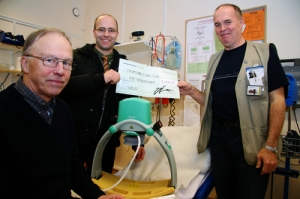Företagaren Thomas Östensson, i mitten, lämnar över en check till distriktsläkaren Anders Ehnberg för köpet av en hjärtmassagemaskin. Ivar Sennvall, till vänster, visar upp maskinen. Text/Foto: Holger Persson |