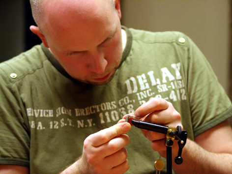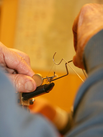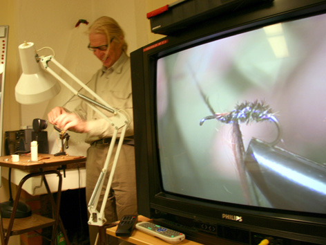 Ordförande Ulf Hammarberg visar hur en fluga binds. Text/foto: Holger Persson. |