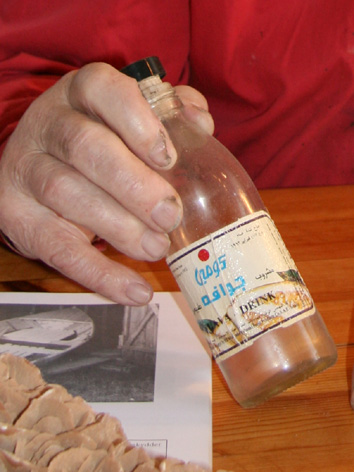Ifrån Sahara har Erik tagit med sig sand och flaskan har han vatten från floden Jordan där Johannes döpare döptes. Vatten som Erik haft i dopfunt åt sina barnbarn.