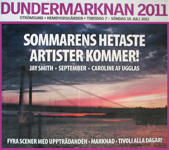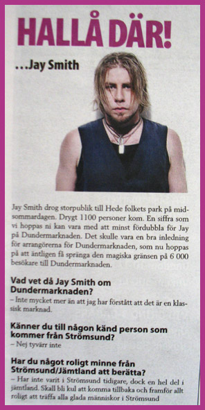 | HALLÅ DÄR ...Jay Smith Jay Smith drog storpublik till Hede folkets park på midsommardagen. Drygt 1100 personer kom. En siffra som vi hoppas ni kan vara med att minst fördubbla för Jay på Dundermarknaden. Det skulle vara en bra inledning på Dundermarknaden för arrangörerna, som nu hoppas på att äntligen få spränga den magiska gränsen för 6000 besökare till Dundermarknaden.