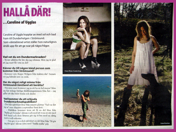 HALLÅ DÄR ...Caroline af Ugglas. Caroline af Uggla kopplar av med sol och bad fram till Dunderhelgen i Strömsund. Som väletablerad artist ställer hon naturligtvis ändå upp för att ge svar på några frågor. Vad vet du om Dundermarknaden?
