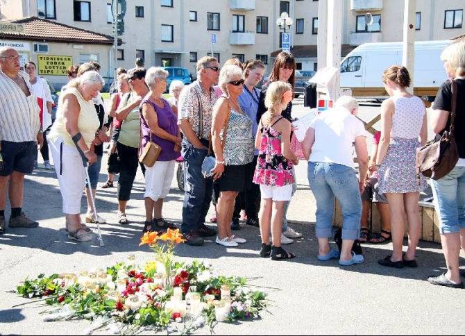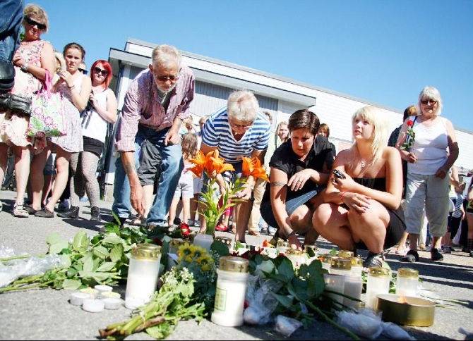 Blommor och ljus tändes på Vattudalstorget i Strömsund för att hedra offren för terrorattackerna i Norge. Foto: Holger Persson |