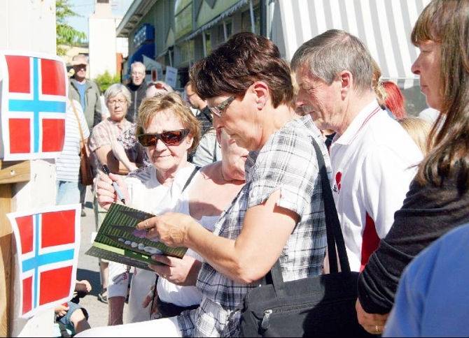 Här är några i full färd med att skriva i boken i Strömsund för att visa sitt deltagande för offren i terrordåden i Norge.