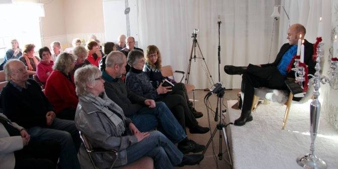 Ett 50-tal personer hade bänkat sig för att höra författaren Peter Lucas Erixon högläsa ur sin bok Silversnöret i Ulriksfors i lördags. Foto/Text: Holger Persson. |
