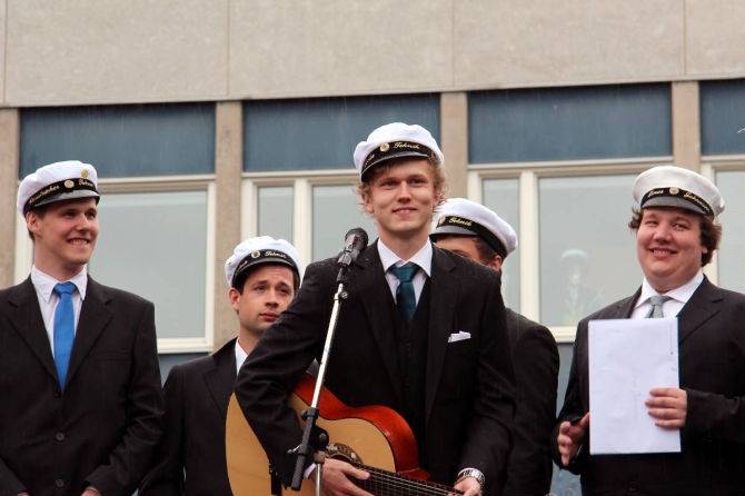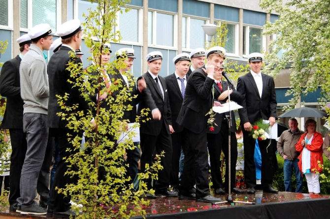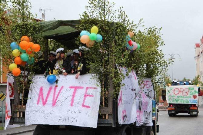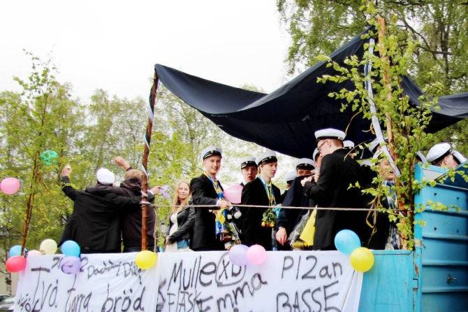Vädret hindrade inte studenterna från att fira Årets studentfirande i Strömsund kantades med regn, men glädjen som fanns bland studenterna kunde inget dåligt väder förhindra. Skratt, tårar, minnen och framtidsplaner strålade ut från studenterna när de kom ut från Hjalmar Strömerskolan vid klockan 12 på torsdagen. Efter samling utanför skolan var det dags för sedvanligt festtåg på lastbilsflak genom samhället. Banderoller och dunkande hög musik med allsång från studenter spred skön lunchmusik. |