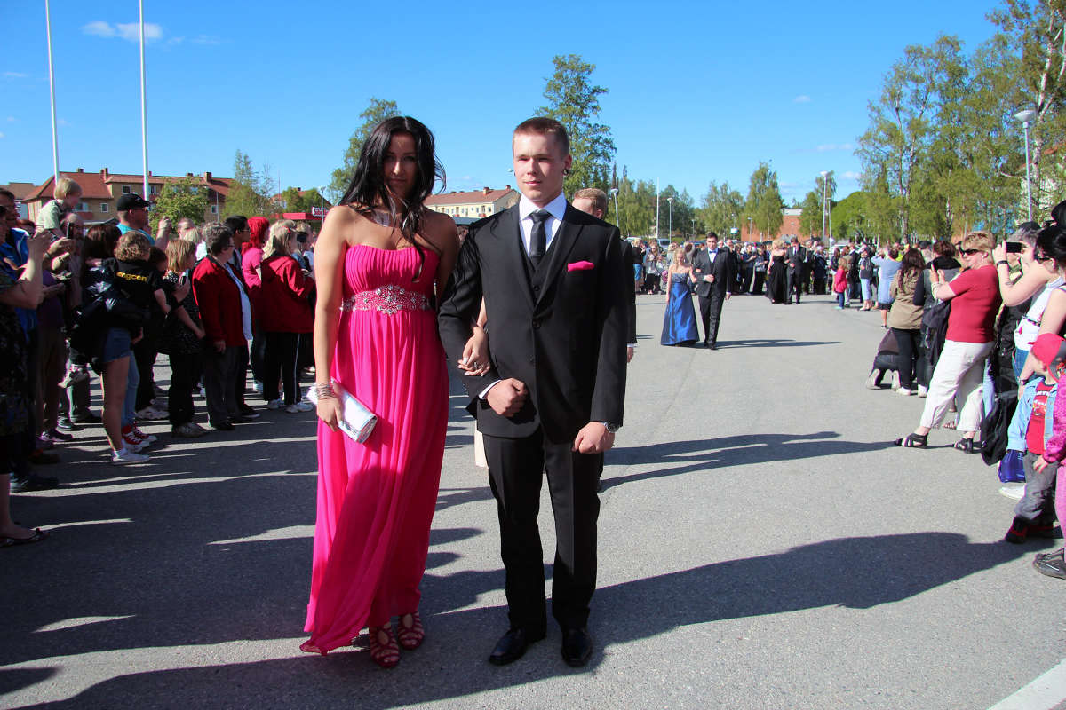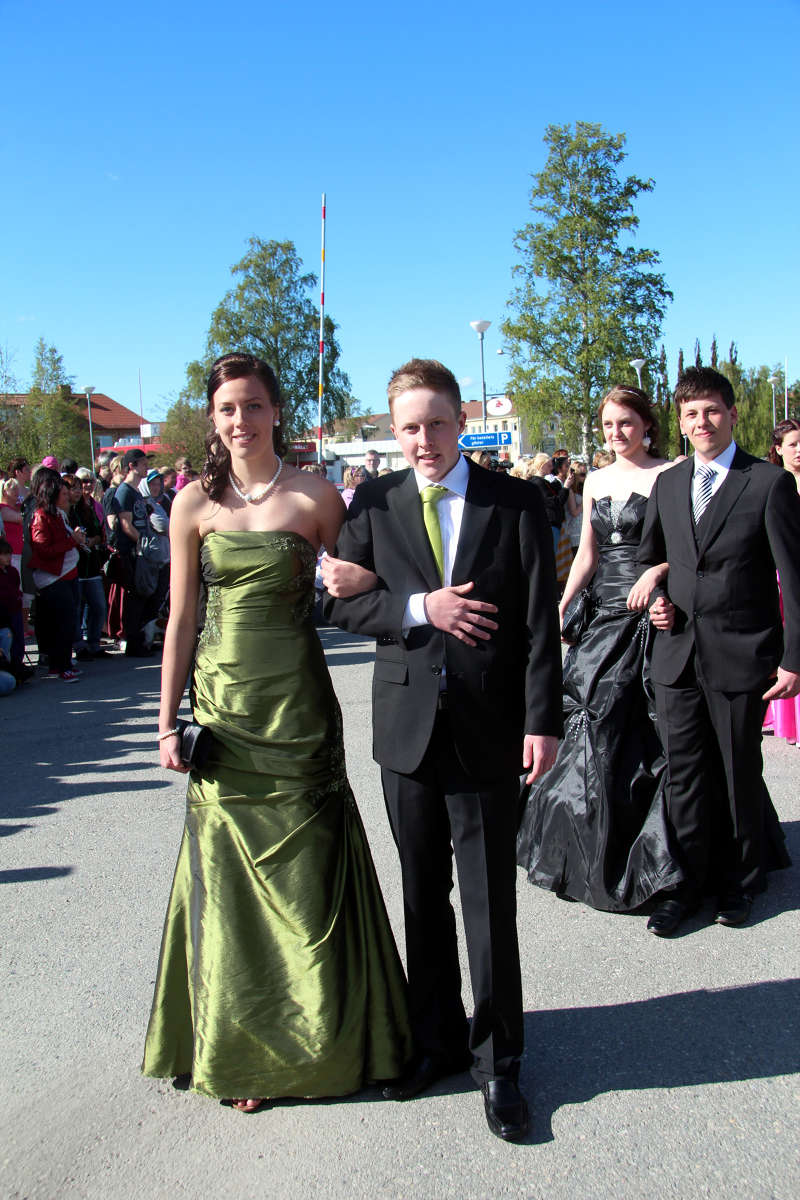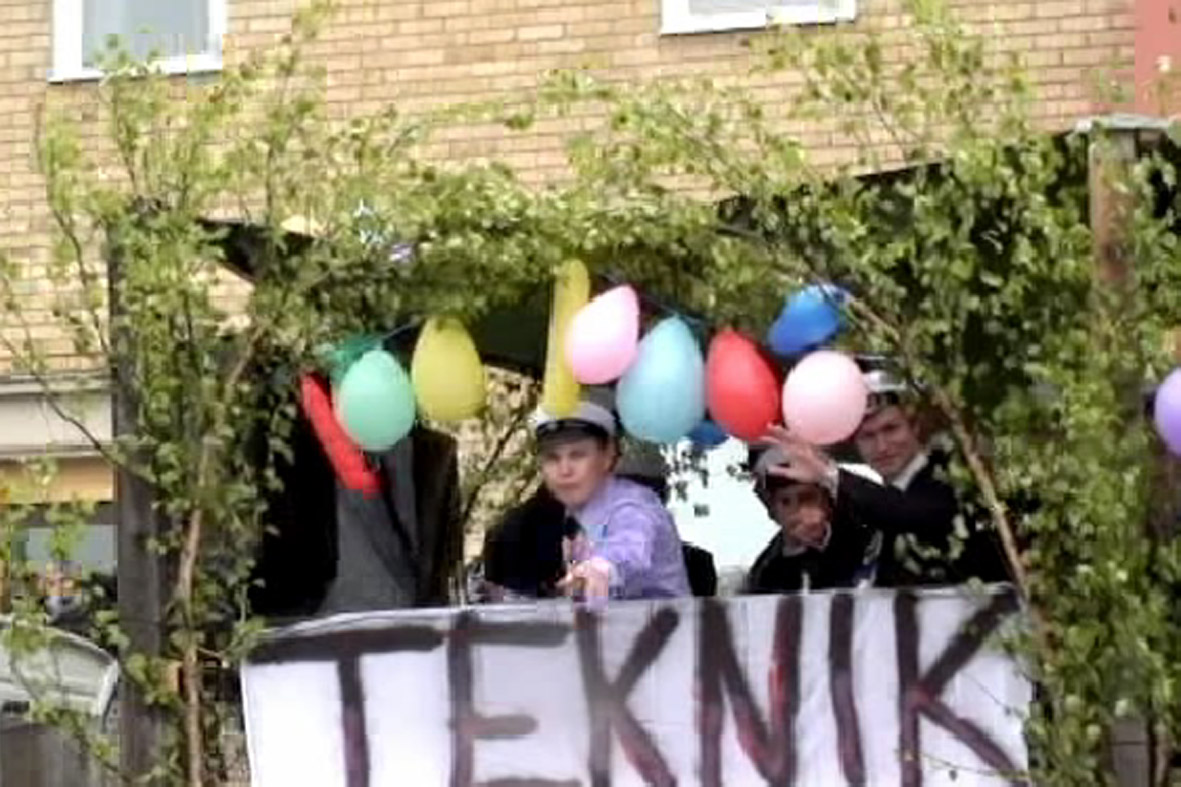 Glada studenter i regnet Klockan 12.00 steg första studenterna ut genom dörren på Hjalmar Strömerskolan. Sedvanligt presenterade studenterna, med glimten i ögat, hur deras år och lärarna varit. Efter att släkten fått gratulera sina studenter samlades eleverna på respektive lastbilsflak för färd genom Strömsunds gator. Ekipagen var utrustade med gigantiska ljudanläggningar och en del även med skydd mot regnet. |