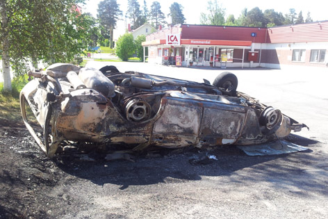 Vid tretiden i natt inkom ett larm om att upp och nedvänd personbil på parkeringen utanför Ica i Hammerdal brann med öppna lågor. Foto: Holger Persson. |